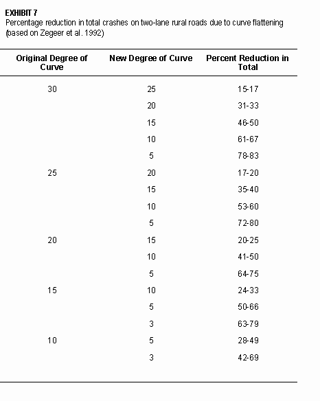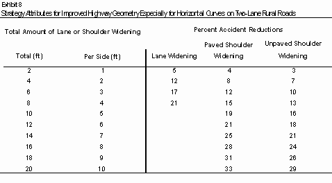 Exhibit 6 lists the objectives and several related strategies for reducing the consequences of ROR crashes. Details of these strategies are covered in the following narrative. It should be noted that this does not represent a listing of all possible strategies to reduce ROR crashes. For example, roadway design or rehabilitation strategies such as building wide lanes or adding lane width on entire systems or subsystems, or using positive guidance principals in new roadway design can clearly affect ROR crashes. However, these strategies are most likely employed in the design phase for new facilities or rehabilitiation of long sections of roadways, and are often relatively high-cost improvements. AASHTO has chosen to concentrate efforts in this Guide on lower cost strategies which can be implemented relatively quickly, which also implies strategies that can be applied to "spots" on the roadway (e.g., lane widening on hazardous curves). With few exceptions, it is these lower cost, quickly implementable strategies that are covered in the following pages.