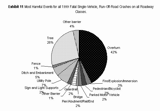 Strategies that are directed at roadside design range from very costly to relatively inexpensive. The former include: purchasing new right-of-way, building wider and safer clear zones where limited zones now exist, and clearing and grading clear zones on right-of-way already owned. Less costly (but not inexpensive) strategies may include: replacing non-breakaway or outdated roadside hardware (e.g., guardrail ends, culverts) with newer technology at selected locations, burying utility lines, or relocating utility poles. The question for the agency then becomes one of how to spend limited roadside safety dollars in the most cost-efficient manner. That is, what should be targeted, and how?FARS data for all roadway classes shown in Exhibit 11 indicate that the "Most Harmful Event" in a non-intersection ROR crash is most likely to be an overturn (42.1 percent of 1999 ROR single-vehicle fatalities), an impact with a tree (25.4 percent), an impact with a utility pole (7.2 percent), or an impact with a ditch or embankment (4.9 percent). Most other roadside objects (e.g., culverts, posts, and guardrails) are found to be the Most Harmful Event in 2 percent or less of the fatalities.