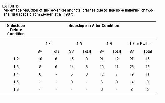 Three strategy areas have been covered for roadside improvements – rollover reduction due to flattening sideslopes, single-vehicle crash reduction due to flattening and widening sideslopes, and single-vehicle crash and crash-severity reduction related to improvements in roadside hardware (e.g., replacing older hardware designs with newer designs). Historically, most roadside design and roadside hardware design improvements have been based on crash testing, and recently on computer simulation. Due to the difficulty in collecting the necessary roadside inventory data to conduct a well-designed accident based study, few exist. Thus, crash-based estimates of effectiveness are limited. The following narrative describes some of the more important studies. Zegeer, et al. examined the effects of sideslope on both rollover crashes and on total single-vehicle crashes. They used field-measured crash, sideslope, cross-section, and traffic data from approximately 1,800 miles on rural two-lane roads in three states. The rollover data were limited, making analysis of individual slope categories difficult. However, the authors found that rollover rates were significantly higher on slopes of 1:4 or steeper as compared to slopes of 1:5 or flatter. That is, in terms of rollover crashes, the 1:4 slopes were similar to the steeper 1:3 and 1:2 slopes. While the Roadway Design Guide would indicate the need for guardrail protection for 1:2 slopes, it would not for 1:3 slopes. The latter are generally considered to be "traversable – non-recoverable," indicating that the vehicle would be expected to either stop on such a slope or continue to the bottom of the slope without overturning. Based upon the same study, (and a much larger sample size), it is concluded that single-vehicle ROR crashes (which include, but are not limited to, rollovers) can be significantly reduced by flattening existing sideslopes to 1:4 or flatter. As shown in Exhibit 17, the estimated reduction in SV ROR crashes on two-lane rural roads ranges up to approximately 27% (i.e., for flattening a 1:2 slope to 1:7 or flatter). Because ROR crashes are a major component of total crashes on two-lane rural roads, and because flatter and safer sideslopes can decrease some head-on and sideswipe crashes due to safer recoveries, the corresponding decrease in total crashes for this example is an estimated 15%. These estimates are made under the assumption that the clear zone width stays the same, and that the resulting sideslope is relatively free of rigid objects.