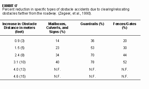 With respect to removing roadside hardware from the clear zone or relocating them farther from the travel way, a study by Zegeer, et al. (1990) developed the effectiveness estimates shown in Exhibit 20 for two-lane rural roads. As can be seen, for example, moving culvert headwalls from 1.5 to 4.5 m (5 feet to 15 feet) from the roadway would result in an expected 40 percent reduction in culvert headwall collisions on two-lane rural roads. Placing guardrails an additional 1.5 m (5 feet) from the roadway would be expected to reduce the corresponding guardrail accidents by 53 percent. It is noted that all these estimates are based upon the assumption that removal of a specific object leaves a wider clear zone, and that other potentially hazardous objects do not remain at the same distance from the roadway. For example, if the culverts are at the edge of a row of large trees, then it is likely that culvert crashes will only be replaced by additional tree crashes.