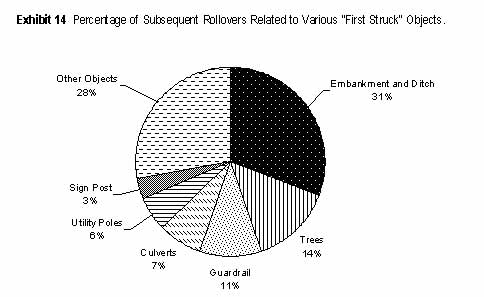 With respect to roadside hardware, the 1999 FARS data also indicate that, when a rollover occurs as a "subsequent event," the first thing struck is a ditch or embankment in approximately 31 percent of the cases (See Exhibit 14). Other "first-struck" objects include trees (13.7 percent of the fatal crashes with subsequent rollovers), guardrail (10.8 percent), culverts (7.3 percent), utility poles (6.0 percent), and sign posts (3.4 percent).