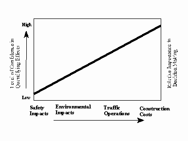 Designers tend to weigh those factors in which they have the greatest confidence. These include estimates of construction costs and quantified right-of-way impacts. Public opinions regarding alternative decisions also tend to carry weight in decision-making. The designer often considers information about crashes — their location, environmental factors, causes, etc., as incomplete, missing, or clearly erroneous. Typically, they have neither the time nor resources to correct the problems, and so must proceed with information that is of lesser quality than other factors being considered. As a result, designers tend to lack confidence in the ability to predict or quantify safety effects of alternatives. In this manner, safety inevitably becomes a lesser or secondary factor in decision-making. Specific issues are described in the sections below.